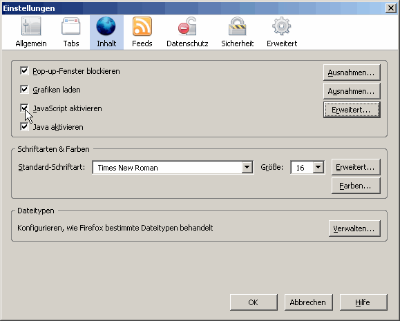 JavaScript sollte generell schon aktiviert sein. Fall nicht, im Menü Extras > Einstellungen > Erweitert den "Eintrag Inhalte/JavaScript aktivieren" setzen.